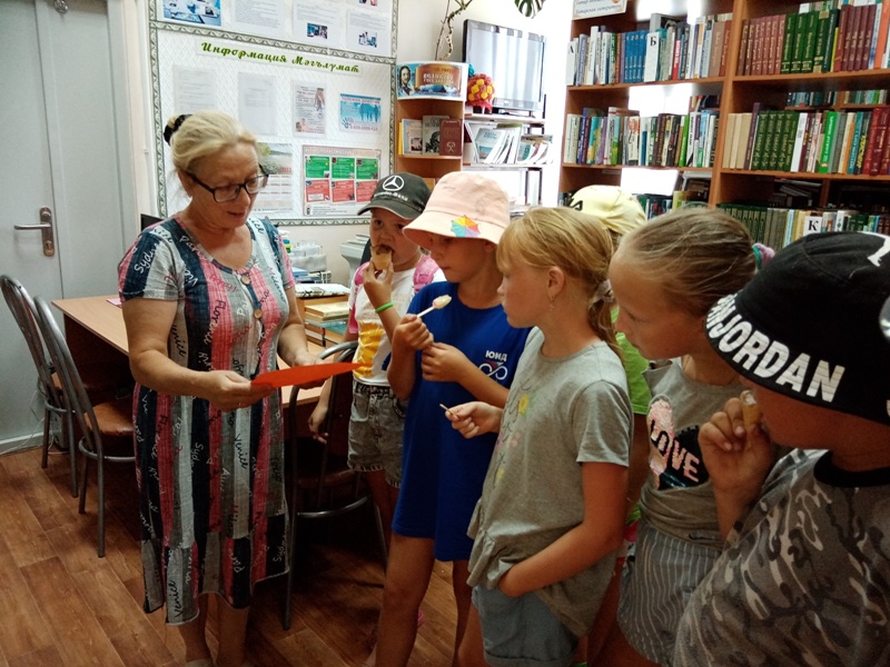Библиотекарь Г. Галимуллина радушно встретила ребят и предложила совершить путешествие в мир книг. Дети с большим интересом слушали рассказ библиотекаря, совершили экскурсию по библиотеке, познакомились с историей села. Ребята обратили внимание на иллюстративные выставки. Потом было проведена викторина о сказочных героях из сказок. Дети получили массу впечатлений.