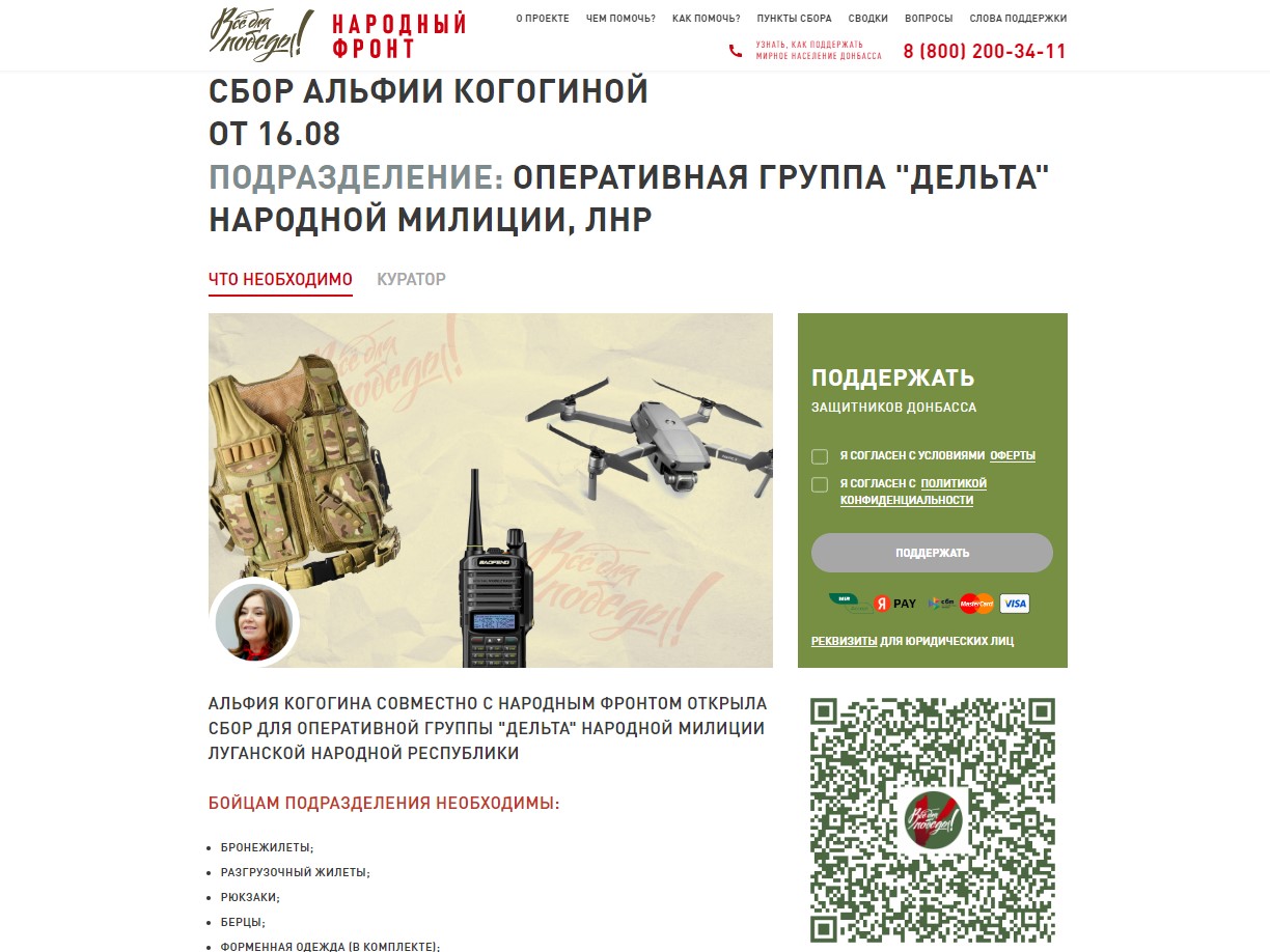 Перечислить любую сумму можно, наведя камеру телефона на qr-код или заполнив форму для оплаты на странице сбора на сайте pobeda.onf.ru. Это 30-й сбор проекта «Все для Победы!», созданный для поддержки народной милиции ЛДНР.