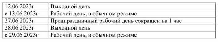 В связи с тем, что в соответствии с частью первой статьи 112 ТК РФ, а также Законом Республики Татарстан от 19.02.1992г. № 1448-XII «О праздничных и памятных днях в Республике Татарстан» 12 июня - День России; 28 июня - Курбан - Байрам являются нерабочими праздничными днями в Республике Татарстан, государственное бюджетное учреждение «Многофункциональный центр предоставления государственных и муниципальных услуг в Республике Татарстан» (далее – ГБУ МФЦ ) предоставляет график работы отделов/филиалов ГБУ МФЦ в предпраздничные, выходные и праздничные дни: