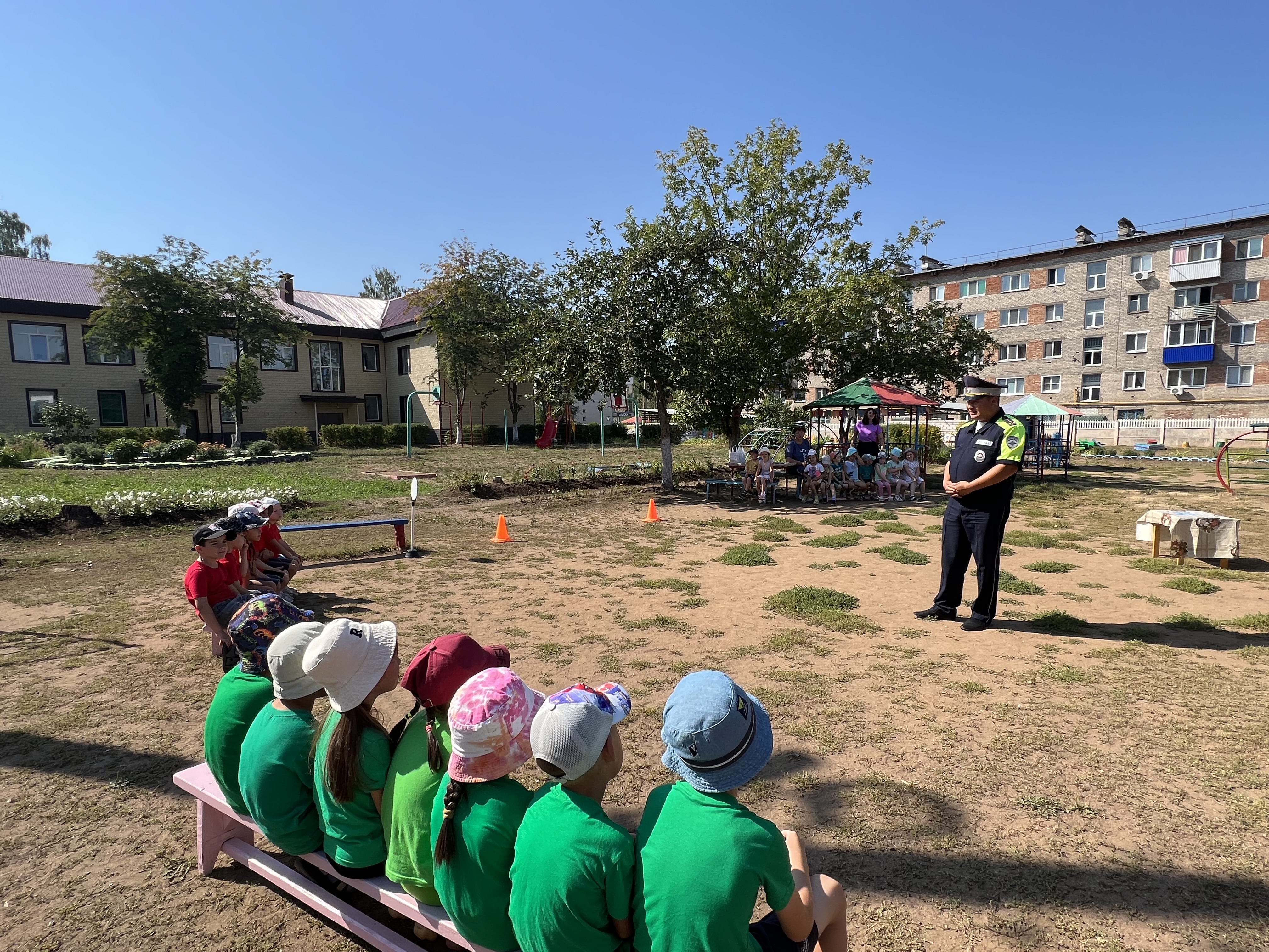 В Менделеевске в рамках ОПМ «Внимание, дети!» начальник ГИБДД встретился с воспитанниками детского сада №6 «Аленушка». Рассказал ребятам, как правильно переходить проезжую часть дороги, какие бывают дорожные знаки, что такое дорожная разметка и многое другое.