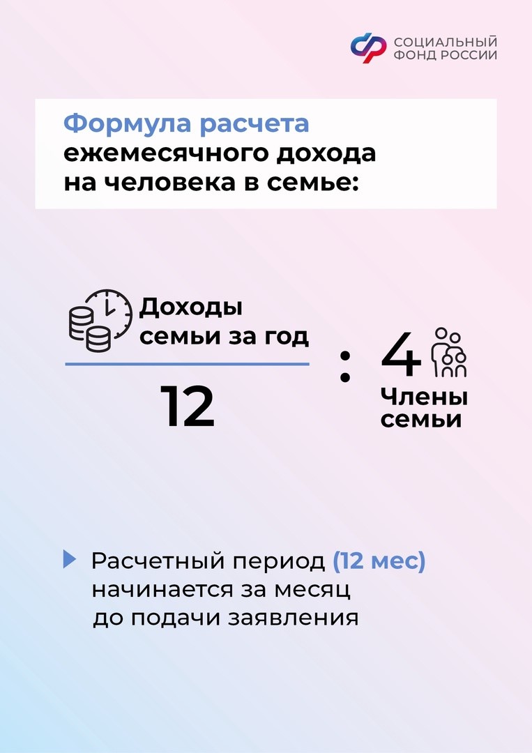 Доходы всех членов семьи за учитываемый год делят на 12, а получившуюся сумму на количество членов семьи. Результат соотносят с прожиточным минимумом в регионе ( по Республике Татарстан – 12219, рублей)