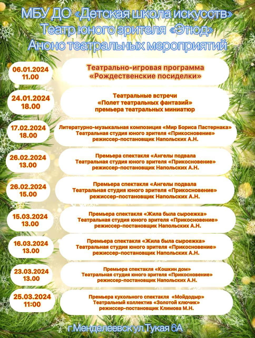 С января 2024 г. в филиале «Этюд» начнутся показы спектаклей. Сейчас они находятся в работе, но в скором времени можно будет их посещать маленьким менделеевцам.