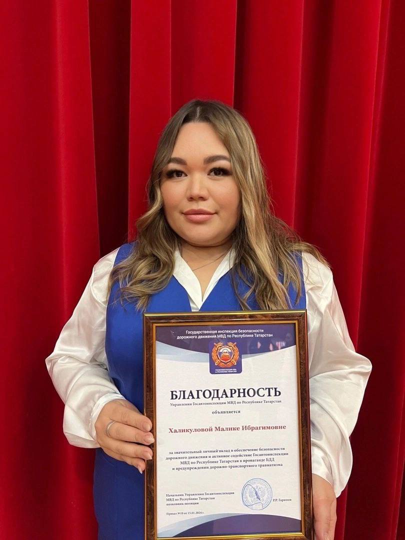 Менделевское ГБУ «Безопасность дорожного движения» в числе лучших в Татарстане по итогам работы в 2023 году Благодарность Управления Госавтоинспекции МВД по Республике Татарстан за значительный вклад в обеспечение безопасности дорожного движения и активное содействие Госавтоинспекции МВД по РТ в пропаганде БДД и предупреждении дорожно-транспортного травматизма объявлена начальнику отделения профилактики ГБУ «БДД» в Менделеевском районе Малике Халикуловой.
