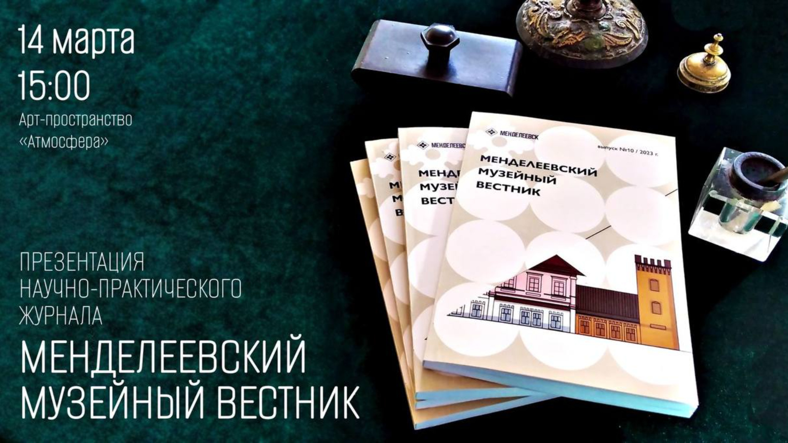 14 марта в 15:00 краеведческий музей г.Менделеевска приглашает всех в купол «Атмосфера» на презентацию 10-го выпуска научно-практического журнала «МЕНДЕЛЕЕВСКИЙ МУЗЕЙНЫЙ ВЕСТНИК»!