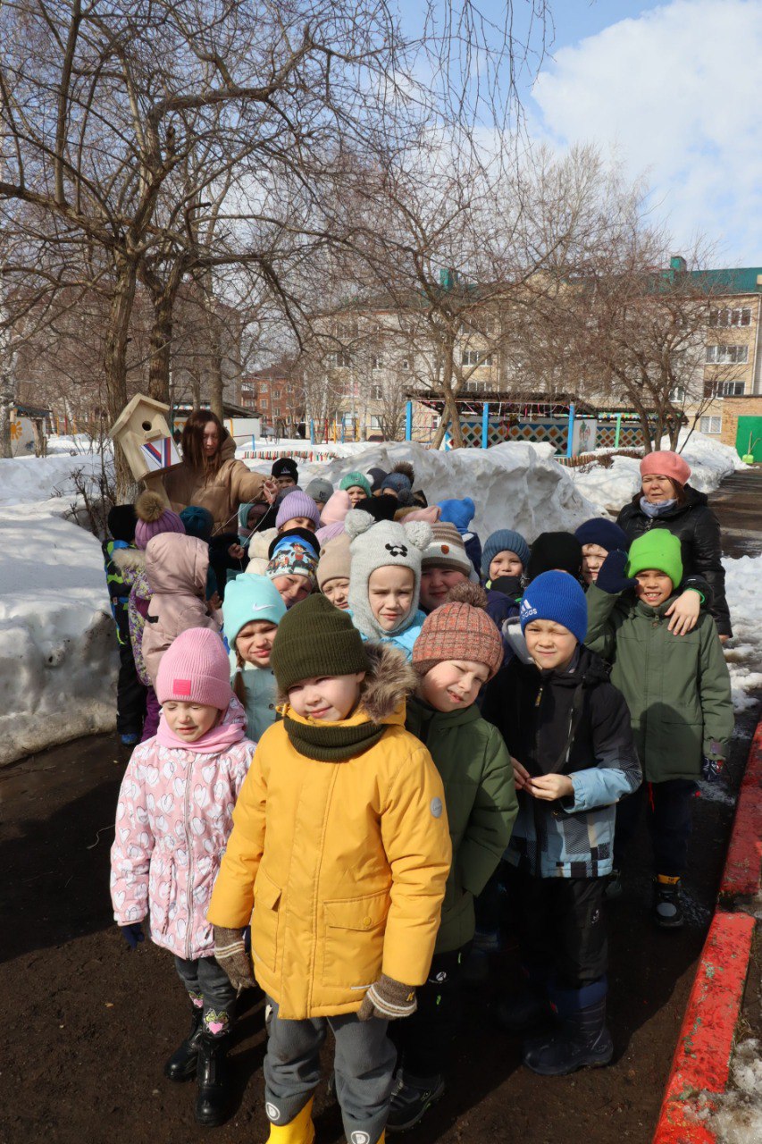 В дошкольном учреждении № 12 «Крепышь» в День птиц повесили пять новых скворечников. Дети вышли на улицу, рассмотрели устройство домика и наблюдали за процессом его установки. Воспитатели рассказали им о роли птиц в природе, пользе для людей и почему птицам нужно делать искусственные гнёзда.