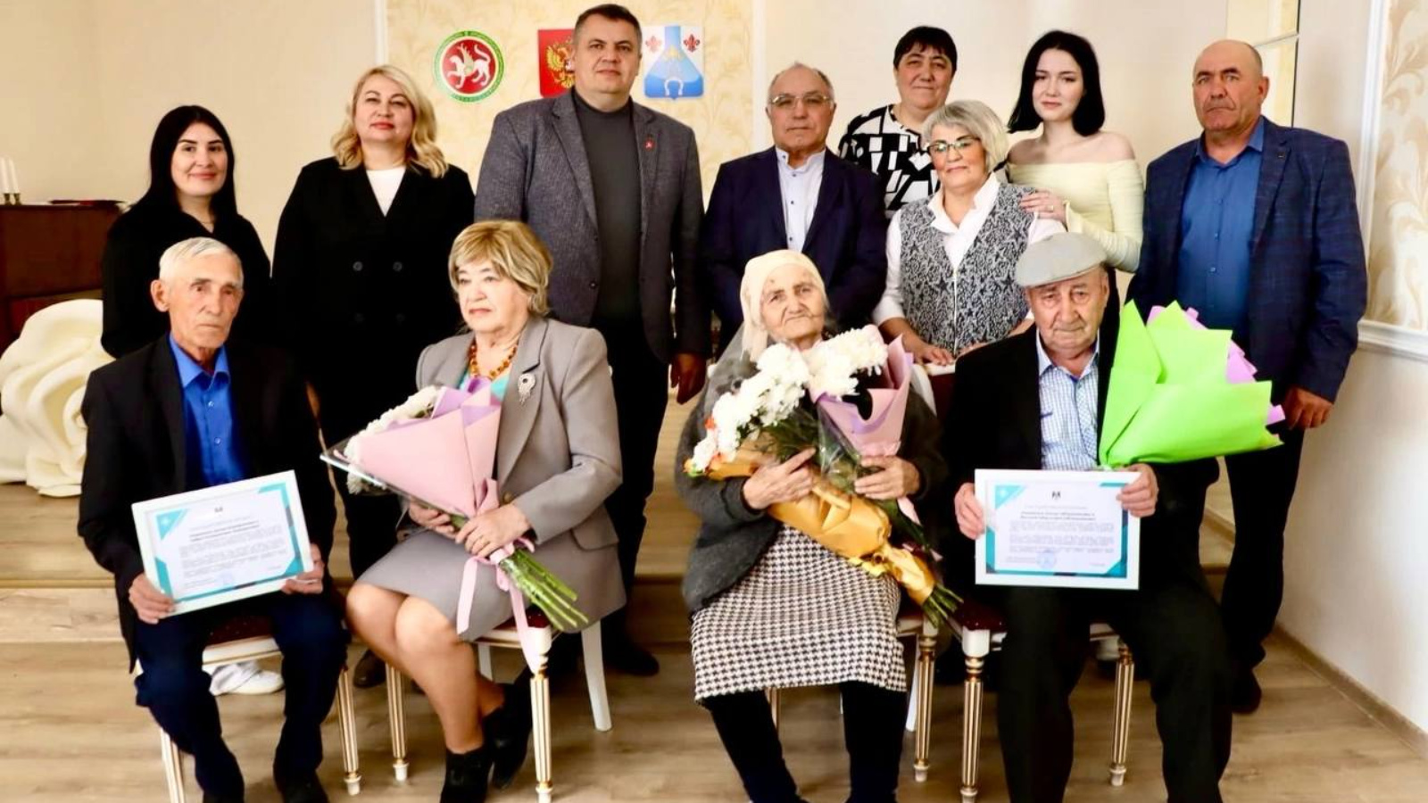 Юбиляров поздравил заместитель руководителя исполкома по социальным вопросам, вручив им благодарственные письма и букеты цветов от главы района.
