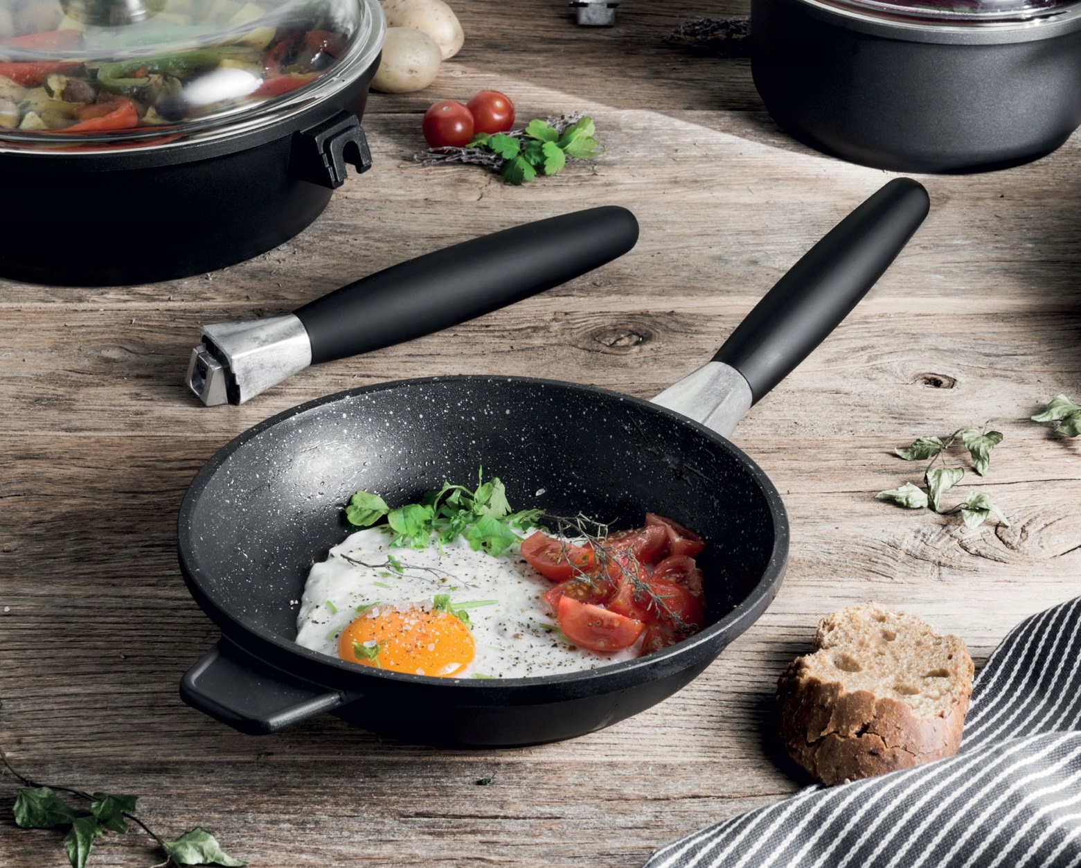 Сковородки из чугуна до сих пор ценятся на личных и профессиональных кухнях. И есть за что, ведь этот материал проверен временем. Чугун быстро и равномерно прогревается и долго хранит тепло, подходит для индукционной плиты, долговечен. Закаленный чугун имеет антипригарные свойства. И за покрытие можно не бояться — переворачивайте еду хоть металлической вилкой и лопаткой.