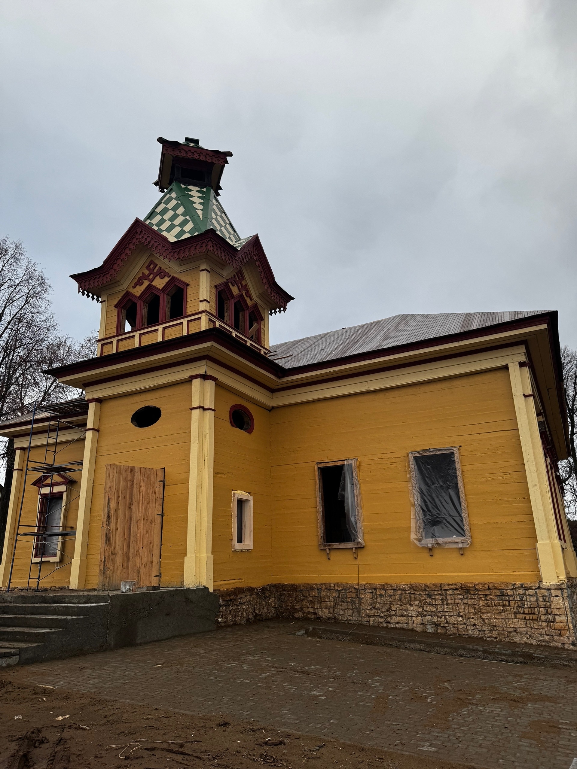 Здесь залиты полы, заменён шпиль, уложена новая кровля, покрашен фасад и выполнено мощение брусчаткой по периметру здания.