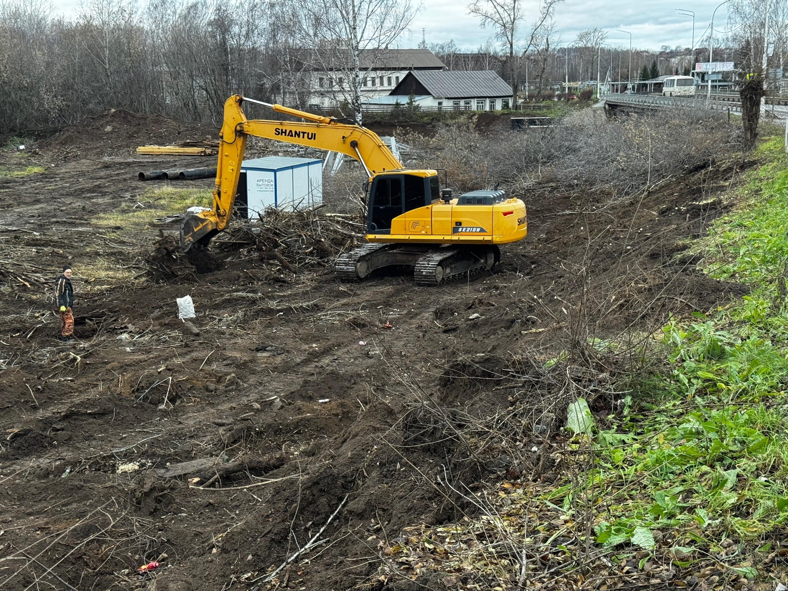 На месте будущего пешеходного моста, который соединит парк «Ушковские острова» и город, проводится расчистка и подготовка площадки для дальнейшего благоустройства.