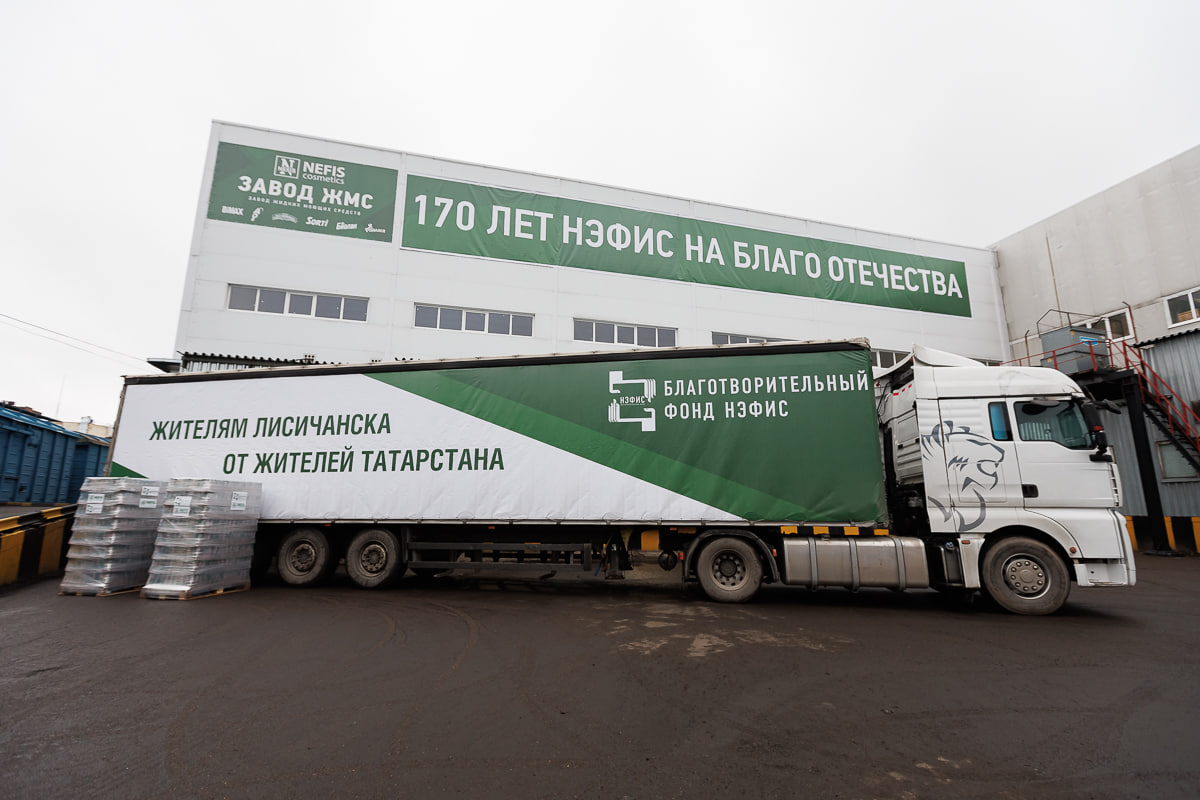 Благотворительный фонд «Нэфис» отправил очередные две гуманитарные фуры в подшефные Татарстану города Лисичанск и Рубежное. В отправке помощи приняли участие Раис РТ Рустам Минниханов, депутат Государственной Думы РФ, учредитель БФ «Нэфис» Ирек Богуславский, председатель совета директоров АО «Нэфис Косметикс» Дмитрий Самаренкин, генеральный директор АО «Нэфис Косметикс» Дина Лаврикова и другие.