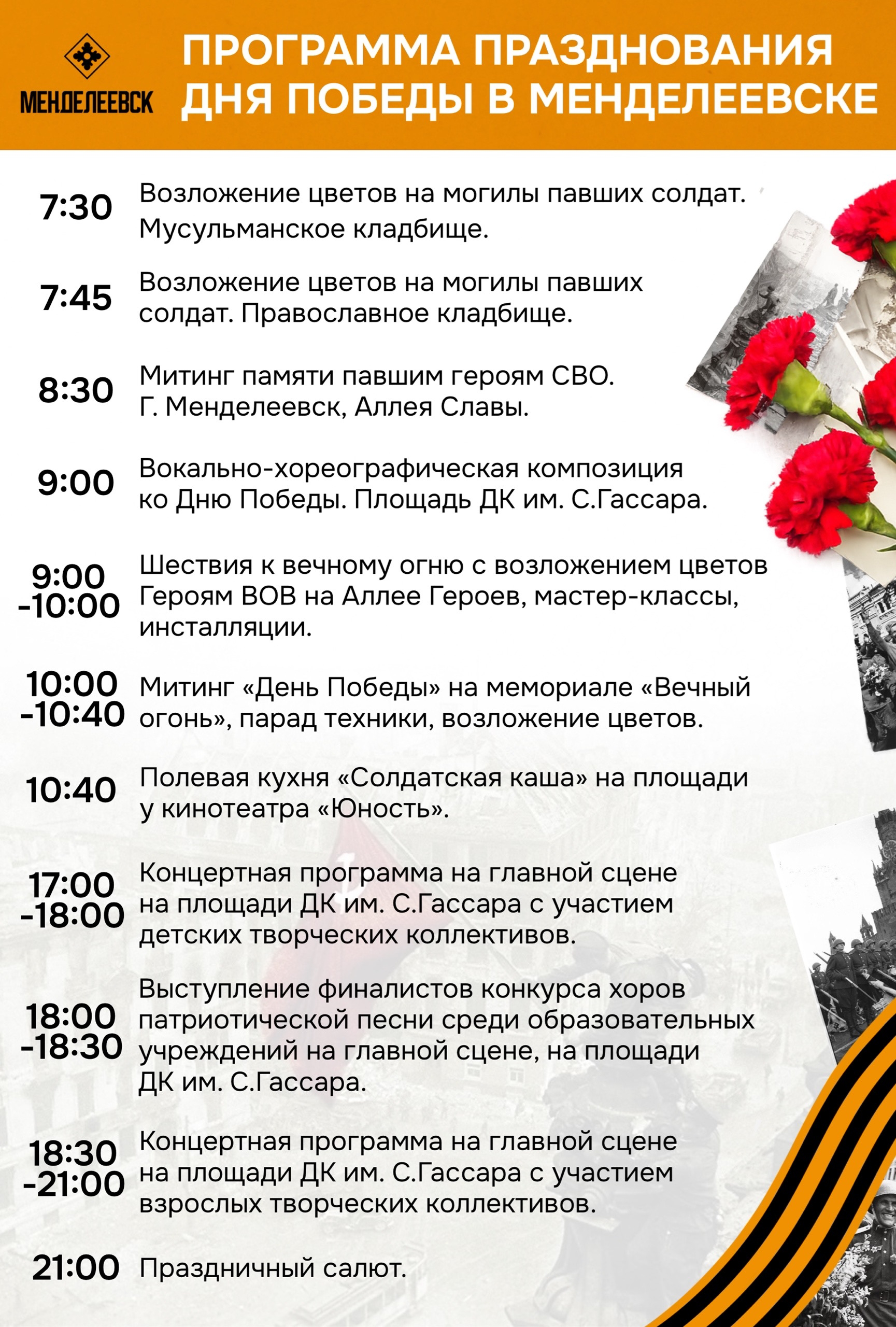 Программа 9 мая в Менделеевске начнётся с возложения цветов и завершится праздничным салютом.