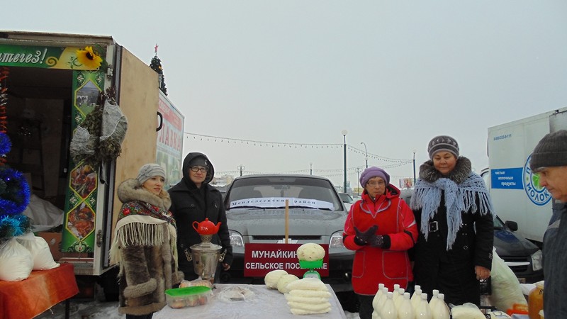13 декабря 2014 года в г.Наб.Челны по адресу Сармановский тракт с 8 часов утра прошла еженедельная сельскохозяйственная ярмарка, на которой также участвовали КФХ Менделеевского муниципального района. Фермеры из Бизякинского, Тураевского, Мунайкинского, Енабердинского сельских поселений продавали свою выращенную продукцию. КФХ Харитонов Г.А. привез молоко, сметану, творог, капусту. КФХ Антипов А.И. реализовывал гусей, продукцию пчеловодства.КФХ Махмудов Э.А. привез для продажи сыр, который приготовили сами ,он очень пришелся по вкусу жителям автограда, Фермер Махмудов Э.А. из села Кураково Енабердинского сельского поселения привозит свою продукцию каждую неделю на ярмарку . Еженедельно продают мясо продавцы убойного цеха Миндубаева Равиля. Каждую неделю выставляет свою рыбную продукцию ИП Буцукина из г. Менделеевска. Продукцию пчеловодства продает еженедельно ИП Малявкина Виктора.