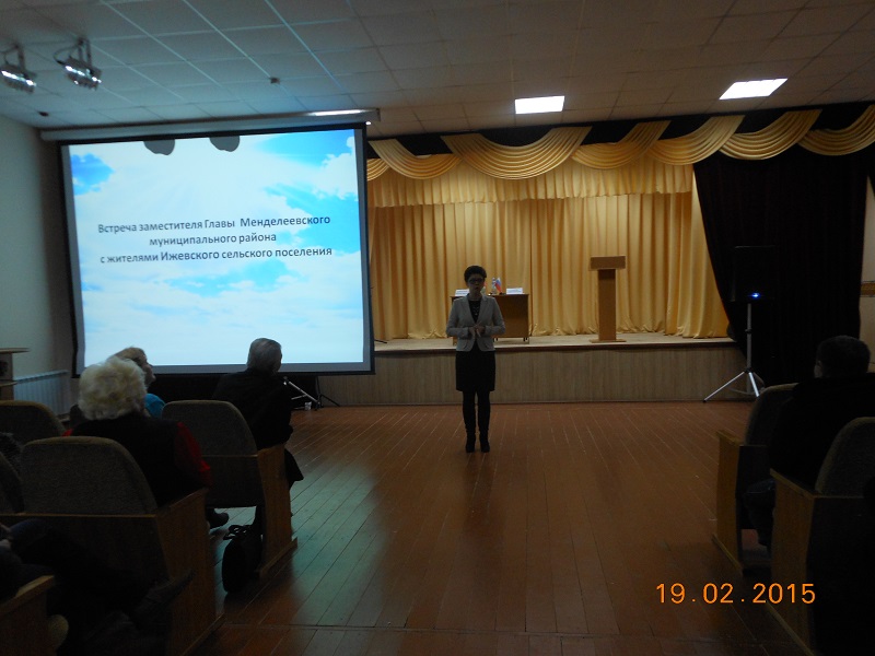 18 февраля прошла встреча заместителя Главы Менделеевского муниципального района Лейсан Галеевой с жителями сельского поселения Ижевки. Отчет руководителей бюджетных организаций о работе за 2014 год о достижениях, проблемах, перспективах в образовании сельской школе представил директор Сергей Данилов; о работе детского сада «Солнышко» доложила заведующая Лилия Валеева. О деятельности сельского дома культуры за 2014 год рассказала заведующая СДК Анна Затирко.
