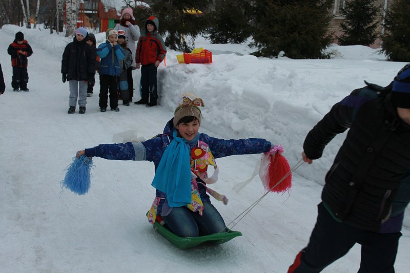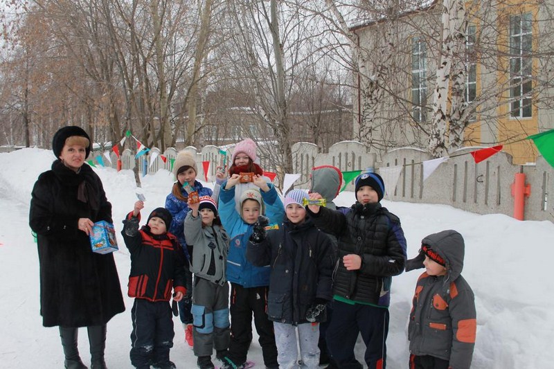 Самую активную девочку Марианну Сабирову нарядили Масленицей и по очереди катали на салазках под дружные аплодисменты маленьких зрителей. Вкусные призы, заботливо подготовленные заведующей Васимой Шакировой, добавили всем хорошего настроения.