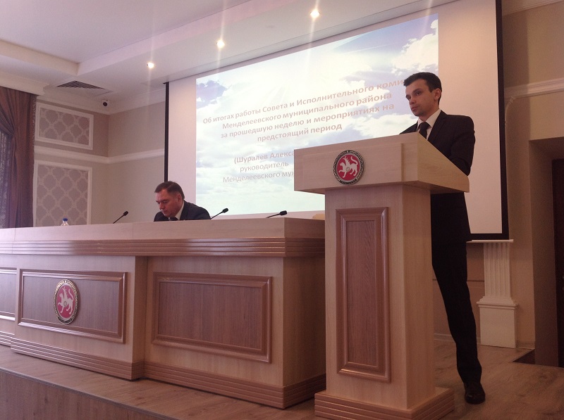 Сегодня Руководитель района Валерий Чершинцев провел еженедельное совещание актива района. На совещании поздравили начальника 86 Пожарной части ФГКУ 12 отряда Федеральной противопожарной службы по Республике Татарстан Александра Балясова с присвоением очередного специального звания подполковника внутренней службы в соответствии с Приказом начальника главного Управления МЧС России по РТ от 29.01.2015 г. № 28. Об оперативной обстановке в городе и районе за прошедшую неделю доложил Айбулат Юнусов– начальник отдела МВД России по Менделеевскому муниципальному району. Об итогах работы Совета и Исполнительного комитета Менделеевского муниципального района за прошедшую неделю и мероприятиях на предстоящий период сообщил Александр Шуралев – руководитель