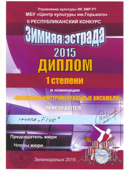 Рок-группа «Five» Центра детского творчества 23 февраля приняла участие в республиканском конкурсе «Зимняя эстрада-2015» в г. Зеленодольск. Ребята представили песни «365» и «Прости», автор которых Зарипов Р.Р., руководитель коллектива.