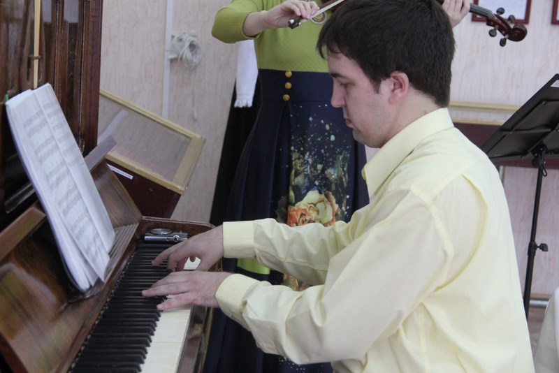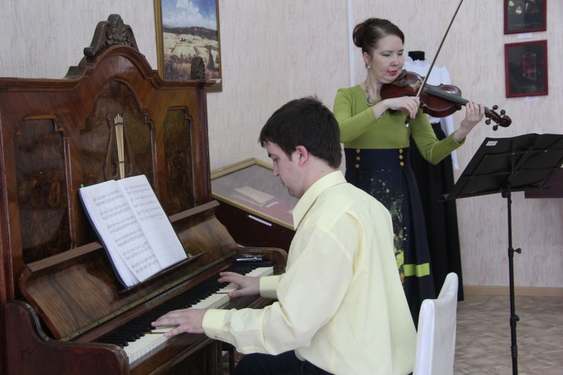 Валерий Замятин музицировал на старинном фортепиано, которому более 120 лет, клавиши сделаны из слоновой кости. Аккомпанировала ему супруга Олеся на скрипке, вместе они исполнили трогательную композицию «Весенняя серенада».