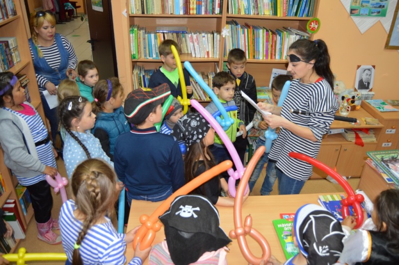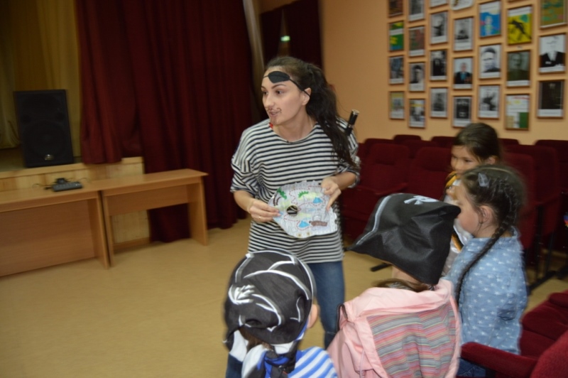 Театрализованное представление подготовили бравые пираты: капитан Крюк (художественный руководитель Калягина Л.И.), пират Барбоса (библиотекарь Ахмедова Н.В.) и Джек Воробей (директор Бакаева Н.А.), которые бодро зазывали ребят на борт своего корабля.