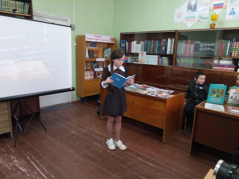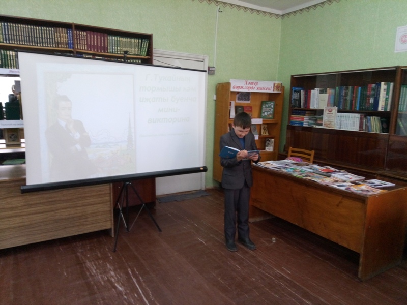 Тукайның биографиясен кыскача искә төшереп киткәннән соң “Г.Тукайның иҗатын беләсеңме?” дигән мини-викторина сорауларына җавап бирделәр. Китапханәче Ф.Башарова укучыларны