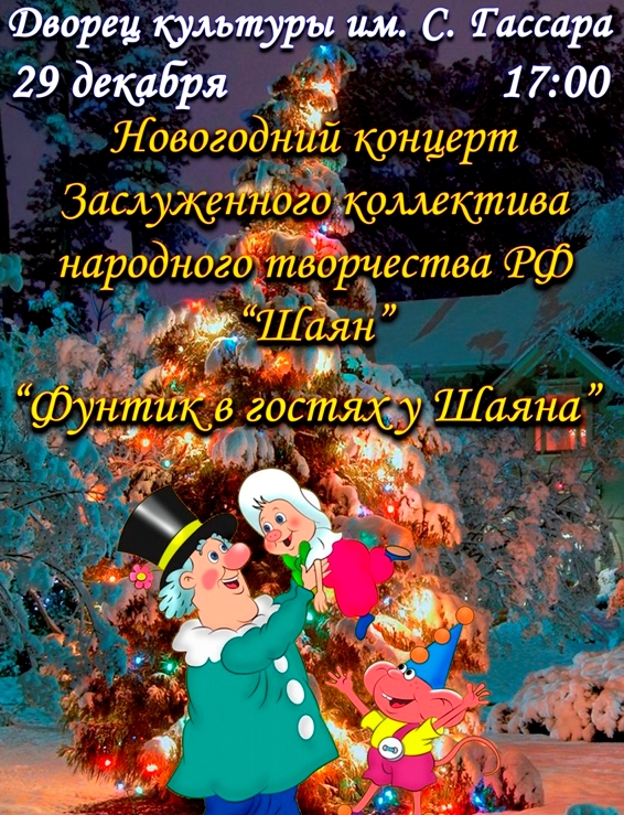 29 декабрдә 2018 елда С.Гассар исемендәге мәдәният сараенда РФ атказанган “Шаян” халык иҗаты коллективының Яңа ел концерты була. Бәйрәм программасы “Фунтик Шаянга кунакка килгән”.