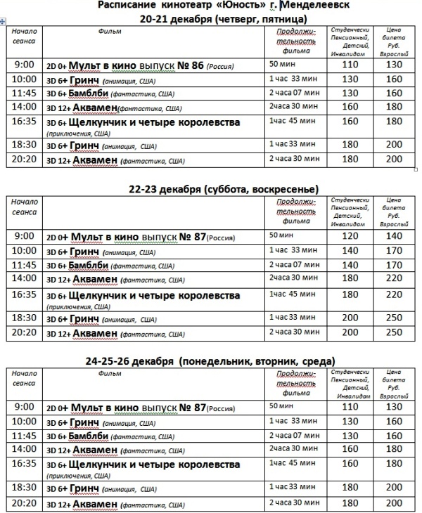 Кинофильмнар расписаниясе Юность кинотеатрында 20-26 декабрь коннәрне