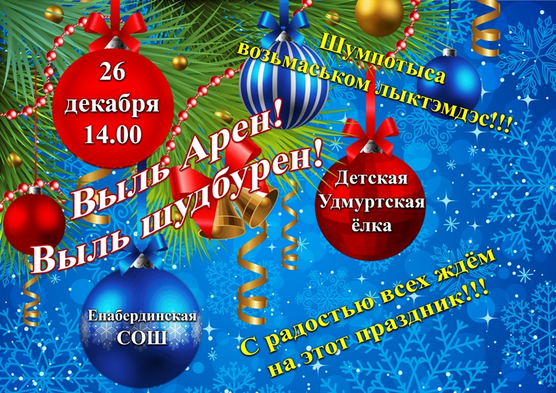 26 декабрдә 2018 елда 14.00 сәгатьтә Яңабирде урта мәктәбендә балаларга удмуртча чыршы бәйрәме “Выль Арен! Выль шудбурен!” үткәрелә. Бәйрәмгә барчагызны шатлык белән көтеп калабыз.