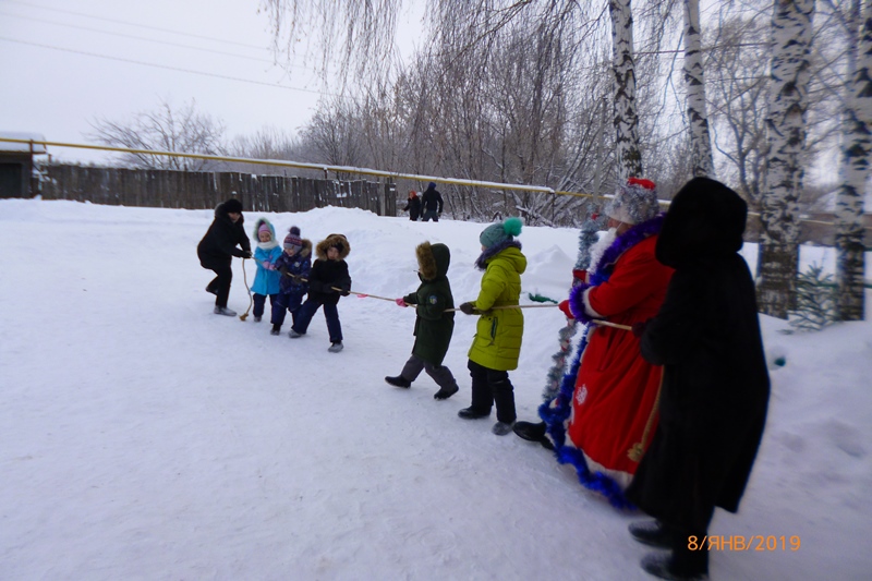 8 гыйнварда Тойма мәдәният йортында каршында мәдәният хезмәткәрләре һәм китапханәче белән берлектә “Кыш бабай белән саф һавада уеннар” программасы үткәрелде. Балалар урамда “Песи һәм тычканнар”, “Чиләк эченә туп ыргыту”, “Утраудан –утрауга” уеннарын уйнадылар , бау тартышып ярыштылар. Кыш Бабай балаларга баллы бүләкләр өләште.
