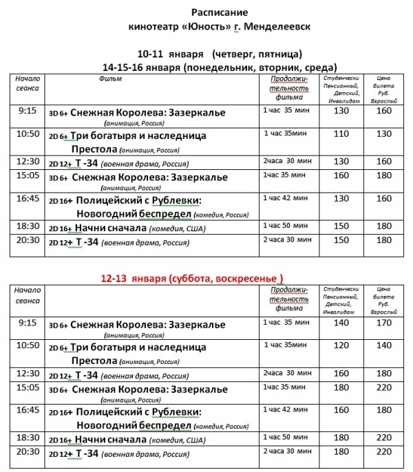Кинофильмнар расписаниясе “Юность” кинотеатрында 10 гыйнвардан 16 гыйнварга