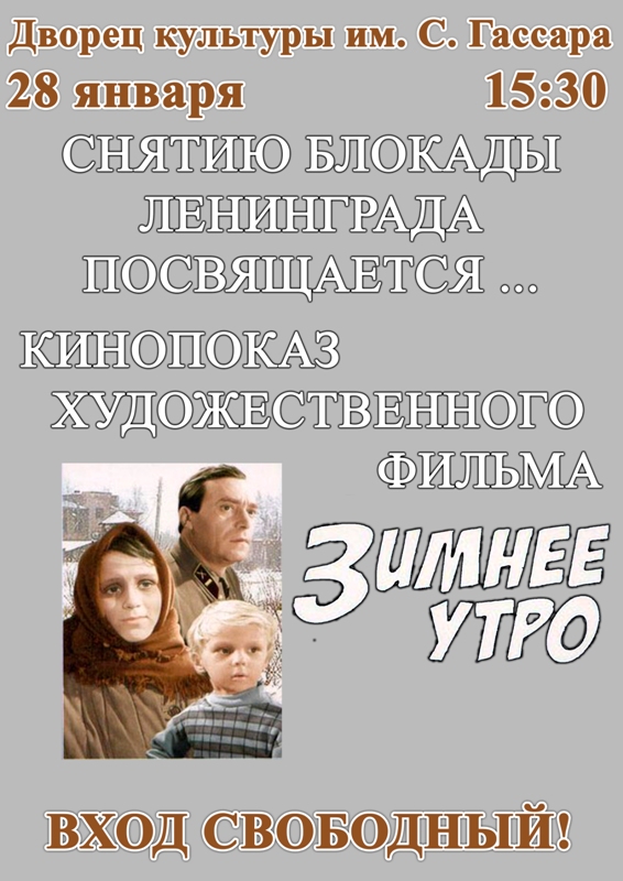 28 гыйнвар көнне 15.30 сәгатьтә С.Гассар исемендәге Мәдәният сарае барлык теләүчеләрне Ленинград блокадасын өзүгә багышланган “Кышкы иртә” фильмын карарга чакыра.