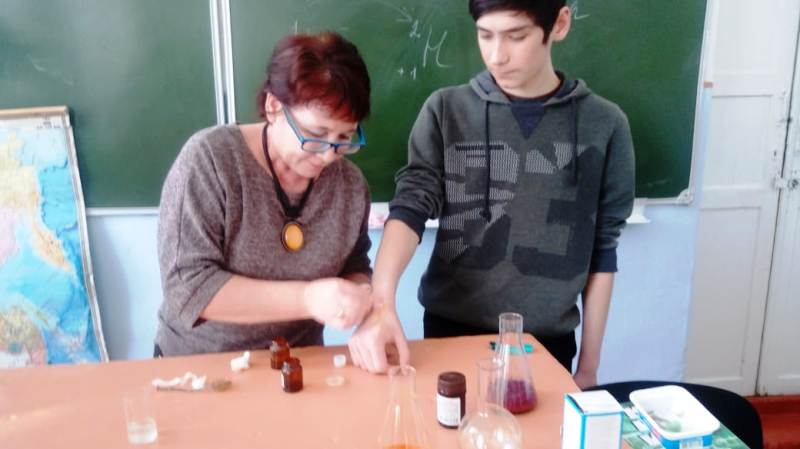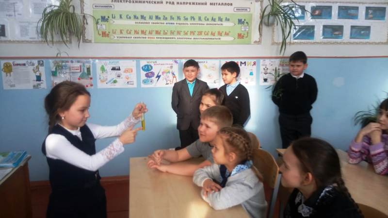 Китапханәче укучыларны Д.Менделеевның тормыш юлы һәм аның турындагы кызыклы фактлар белән таныштырды, бөек химикның химия заводы хуҗасы П.К.Ушковбелән дуслыгы һәм хезмәттәшлеге, безнең Менделеевск шәһәре белән бәйләнеше турында сөйләде. Аннары укучылар урта мәктәпнең химия укытучысы Н.М.Искакова җитәкчелегендә химик реакцияләр ясап күрсәттеләр. Сәгать бик файдалы һәм кызыклы үтте.