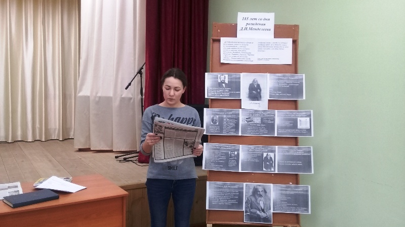 Китапханәче Д.И. Менделеевның тормышы, фәннең төрле өлкәләрендә эшләп зур хезмәт куйган күпкырлы галим булуы турында сөйләде, аның тормышы безнең район белән бәйле булуы, ягъни бертуган Ушковларның Кокшан һәм Бондюг химия заводларында эшләве, төтенсез дары җитештерү буенча тәҗрибәләр үткәрүе, Ушковлар белән хезмәттәшлек итүе турында асссызыклап әйтелде. Соңыннан сөйләгәннәргә йомгак ясап, галимнең тормышы һәм химия фәне буенча викторина сорауларына җаваплар таптылар.