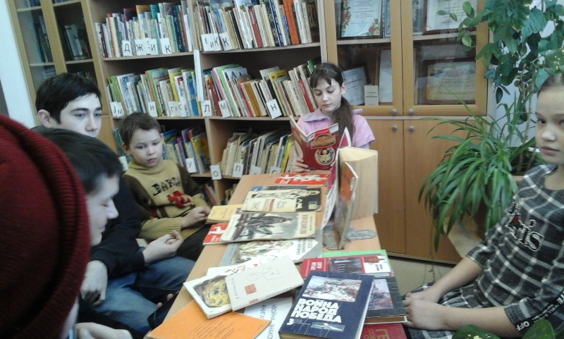 Китапханэдэ «Кэчле рухлылар» дип исемлэнгэн китап кургэзмэсе оештырылды. Китапханэче Данилова Е.И. балаларга Бэек Ватан сугышы елларында разведчикларнын эшчэнлеге, герой-пионерларнын, яшь партизаннарнын кахарманлыгы хэм батырлыклары турында сэйлэде. А.Н.Печерскийнын «Дети-герои Великой Отечественной войны», В.Катаевнын «Сын полка», Б.Лавреневнын «Разведчик Вихров» х.башка китаплардан эзеклэр укылды, э олкэн сыйныф укучылары эчен Д.Медведевнын «Сильные духом», Б.Васильевнын «Завтра была война, Ю.Бондаревнын «Горячий снег» китаплары тэкьдим ителде.