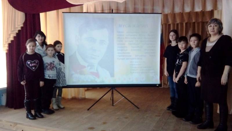 Шул уңайдан 13 февраль көнне китапханәче Яраханова Рузалия Песәй мәдәният йортының сәнгать җитәкчесе Рәхмәтуллина Фирдәүс белән берлектә татар шагыйренә багышланган «Җәлилнен үлмәс җырлары» дигән батырлык дәресе үткәрделәр. Фирдәүс Рәхмәтуллина балаларны шагыйрьнең биографиясе белән таныштырды һәм «Ромашка» уенын үткәрде. Китапханәче «Татар халкының каһарманы – Муса Җәлил " китап күргәзмәсе янында күзәтү үткәрде һәм Муса Җәлил иҗаты белән таныштырды. Балалар «Кызыл ромашка», «Ант» дигән шигырьләрен укыдылар. Чара ахырында аның шигырьләренә язылган жырлар тыңладылар.