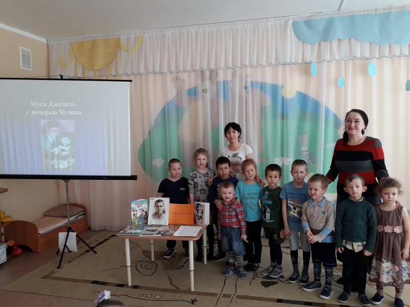 Балаларга фотосүрәтле слайдлар аша шагыйрьнең балалык еллары, кечкенә Мусаның яраткан шөгыльләре, беренче шигырьләре турында сөйләде. Тәрбиячеләр Иванова Э.Г., Молчанова А.Р. “Карак песи”, “Минем этем” шигырьләрен кычкырып укып, эчтэлеге буенча фикер алыштылар. Балалар “Кызыл ромашка” шигыре буенча төшерелгән мультфильм карагач туган хисләре белән уртаклаштылар.