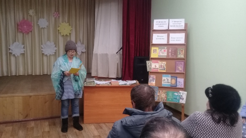 Залдагыларны бу бәйрәмнең әһәмияте, телләр белү, аларны саклау мәсьәләләре белән таныштыргач, һәр халыкның тел җәүһәрләре - халык фольклоры турында сөйләштеләр. Кичәдә рус һәм татар телләрендә, мәкальләр, тизәйткечләр әйтештеләр, табышмакларга җаваплар таптылар, әкиятләр укыдылар, халык җырларын, бала юаткычларны искә төшерделәр. Фольклор кичәсендәге өч милләт вәкиле дә үз телләрендә ягымлы, матур сүзләр әйттеләр. Башенина Екатерина башкарган удмурт халык җыры кичәне тагын да ямьләндереп җибәрде.