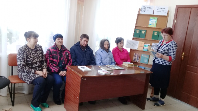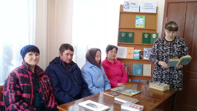 Китапханәче китап укучыларны язучының тормышы, иҗаты һәм күргәзмәгә куелган китаплар белән таныштырды. Китапханәнең даими китап укчылары Галимарданова К.А., Кудрина Г. Р., Зинатуллина Р. М. язучының сугыш елларында язылган “Кем җырлады?”, “Ялгыз каз”, “Бер генә сәгатькә” хикәяләрен сәнгатьле итеп тулысынча укып чыктылар. Китап укучылар “Әйтелмәгән васыять” повестен инде элек укыган булсалар да, Ак Әбинең әйтелмәгән васыяте, аның вафатыннан соң калган әйберләрнең язмышы турында язылган урыннарны яңадан укыдылар. Әдәби сәгатьне йомгаклап китапханәче язучының әсәрләренең тирән психологизм, лирик һәм фәлсәфи әһәмиятлелек белән аерылып торуын һәм язучының тел байлыгы гаять тасвирлы, мәгънәле булуын ассызыклап әйтеп үтте. Бу чараның нәтиҗәсе булып, 4 китап янә үз укучысын тапты.
