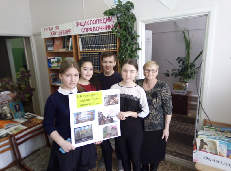 Китапханәче З.Бәйрәмгалиева десантчыларның батырлыгы турында сөйләде. Укучыларга Чечняда һәлак булган 6 нчы ротага багышланган “Үлемсезлеккә атлаган рота”дигән презентация күрсәтелде.