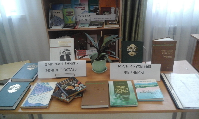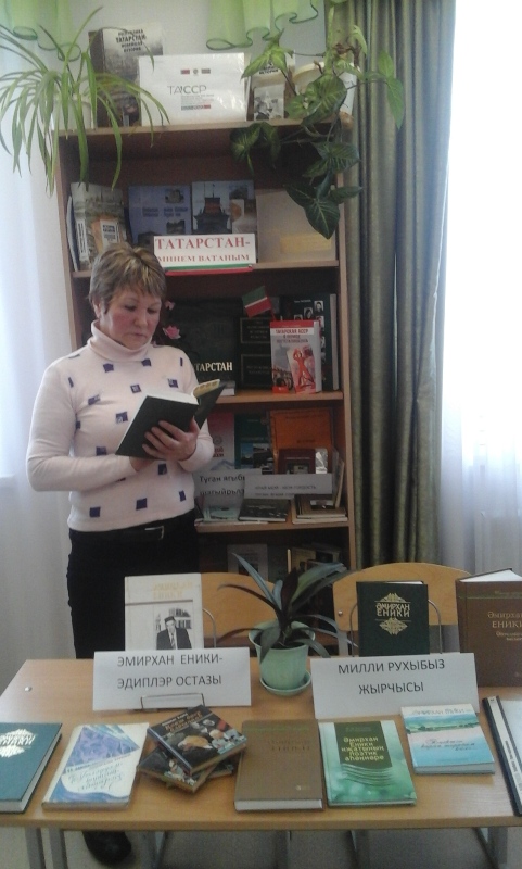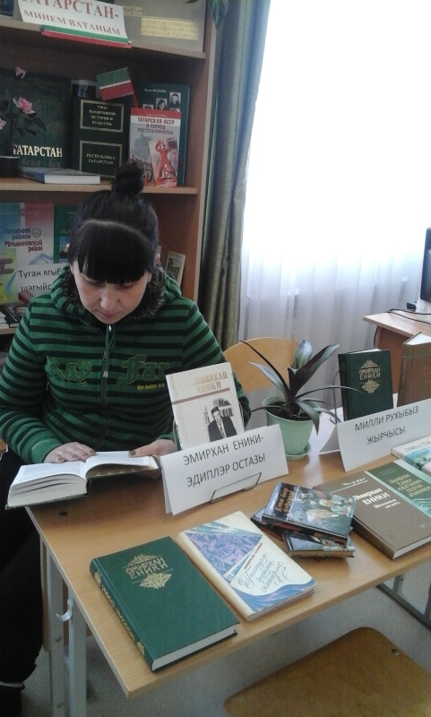 Эмирхан Еники-беренче чиратта ин элек куп гасырлык бай тарихы булган татар эдэбиятынын уз туфрагында житешкэн, уз традициялэрендэ ускэн талант иясе. «Мин сугыш вакытында эдэбиятка кайткан язучы. Дэхшэтле авыр елларда кургэн кичергэннэрем мона сэбэпче булгандыр дип белэм»-ди ул узенен ижаты турында. Э.Еники эдэбиятебезне узенен бик куп якты эсэрлэре белэн баетты. Заманнар узса да, Э.Еники эсэрлэренен кадере арта гына бара. Анын хикэялэре матур мэржэннэрне хэтерлэтэ. Чара башында китапханэче Данилова Е.И. китапханэ укучыларын, язучынын тормыш юлы белэн таныштырды. Китапхэнэдэ бу чарага «Милли рухыбыз жырчысы» дип исемлэнгэн китап кургэзмэсе оештырылды хэм шуна кузэту ясалды. Аннан сон китапханэ укучылары белэн, язучынын «Кояш баер алдыннан», «Гэлэндэм туташ хатирэсе», «Биектэн карап торасым килэ» эсэрлэреннэн эзеклэр укылды. Чара авыл клубы белэн берлектэ уткэрелде.