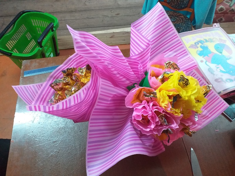 Бүген без сырлы өслекле кәгазьдән роза чәчәге ясарга өйрәндек,эченә конфетта ябыштырдык.Күңел җылысын биреп, тырышып эшләсәк, бүгенге бәйрәм уңаеннан иң якын кешеләребез, әниләребезгә зур бүләк булыр иде.Бәлки безнең ясаган роза чәчәкләре Экрандагы кебек тә килеп чыкмаслар , хуш исле дә булмаслар.Тик шулай да үз кулларың белән ясаган бүләктән дә олы бүләк юктыр.Без бу чәчәкләрне роза чәчәкләре – чәчәкләр патшасы дип атыйбыз, ә саф татар телендә ул гөләп чәчәкләре дип тә, гөлчәчәкләр дип тә очрый.