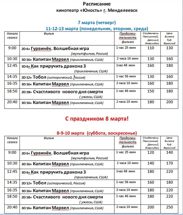 Расписание кинофильм кертелде кинотеатрында «Юность» 6-13 март
