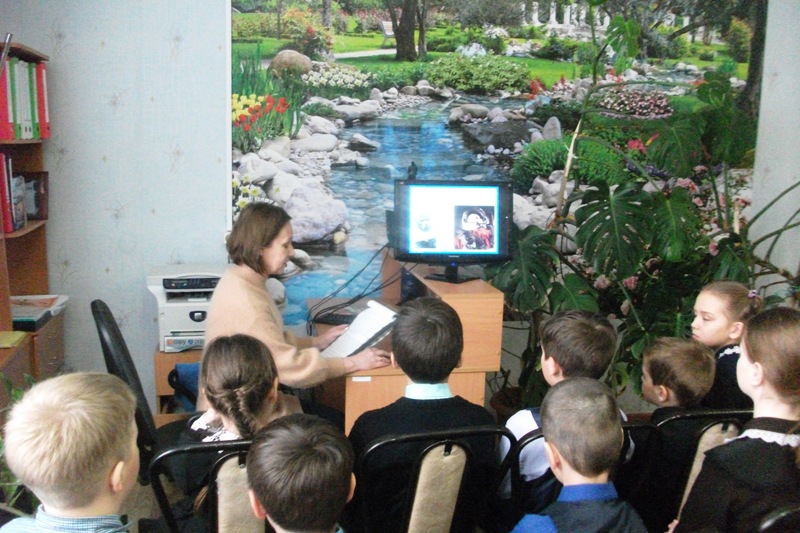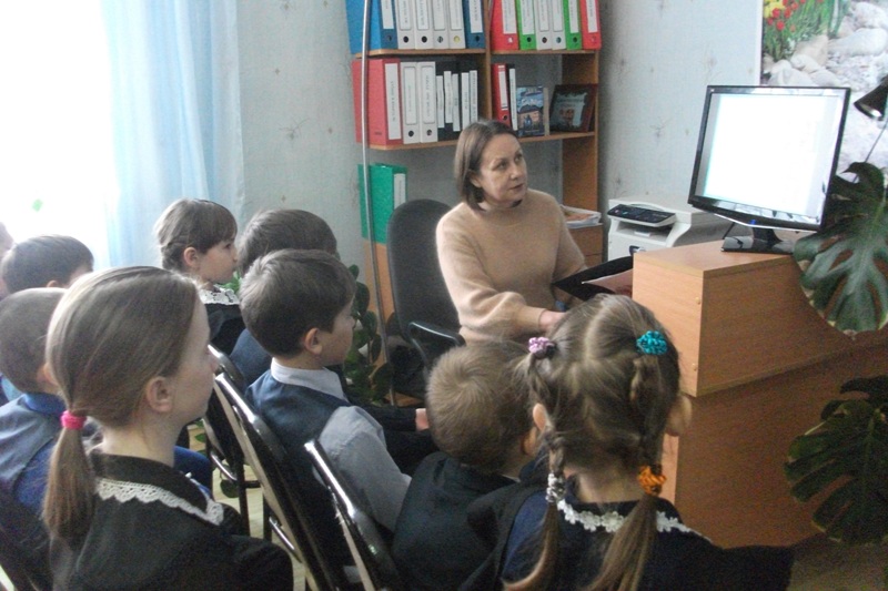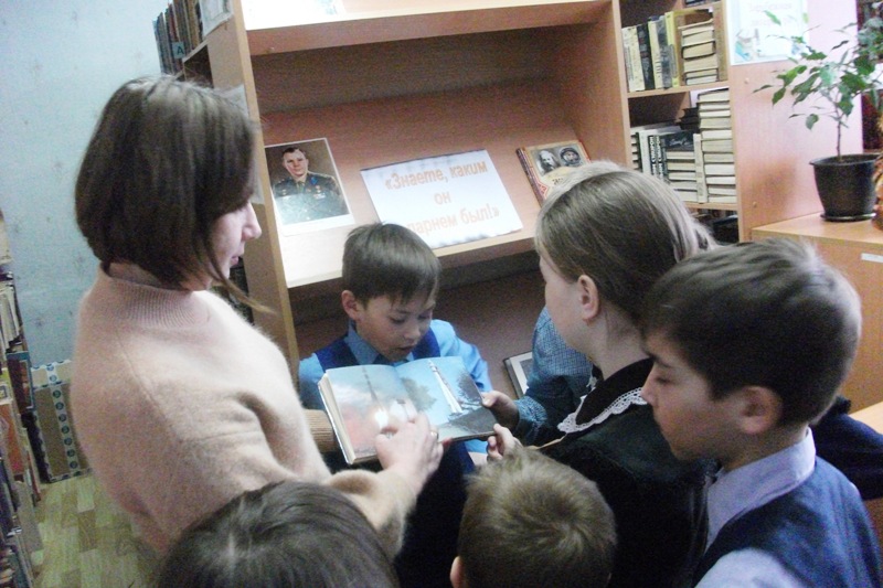 Китапханәче балаларны Юрий Гагаринның биографиясе белән таныштырды, күргәзмәгә күзәтү үткәрде. 1961 елның 12 апрелендә Юрий Гагарин галәм киңлегенә очкан дөнья тарихында беренче кеше була. Юрий Алексеевичка Советлар Союзы Герое исеме бирелде. Ул беренче булды һәм мәңгегә шулай истә калачак!