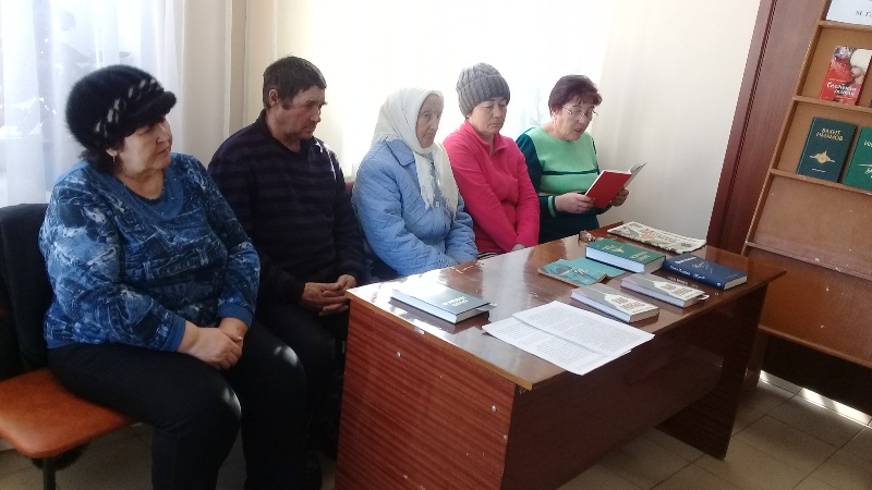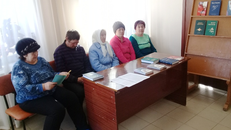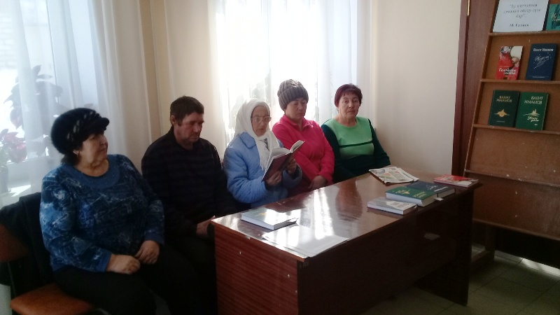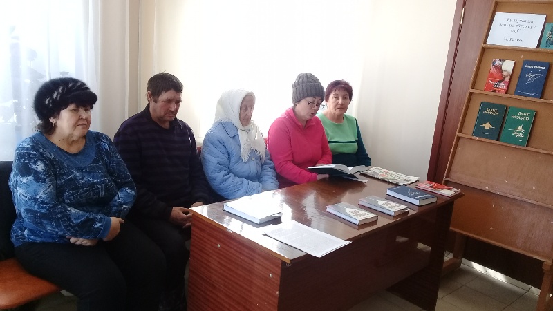 Китапханәче Сафина А.А. язучының тормышы, иҗаты турында сөйләде, китапханәдә булган, күргәзмәгә куелган китапларга күзәтү ясады. “Утлы дала” тарихи романының, “Тозлы яра” повестенең, “Сөләйман солтан” кыйссасының кыскача эчтәлеге белән танышкач, бу китаплардан өзекләр, һәм “Ир канаты” китабыннан “Олапа“ хикәясен тулысынча укыдылар. “Тозлы яра“ һәм “Сөләйман солтан” китапларының эчтәлеген ошатып бер укучы аларны укырга да алды.