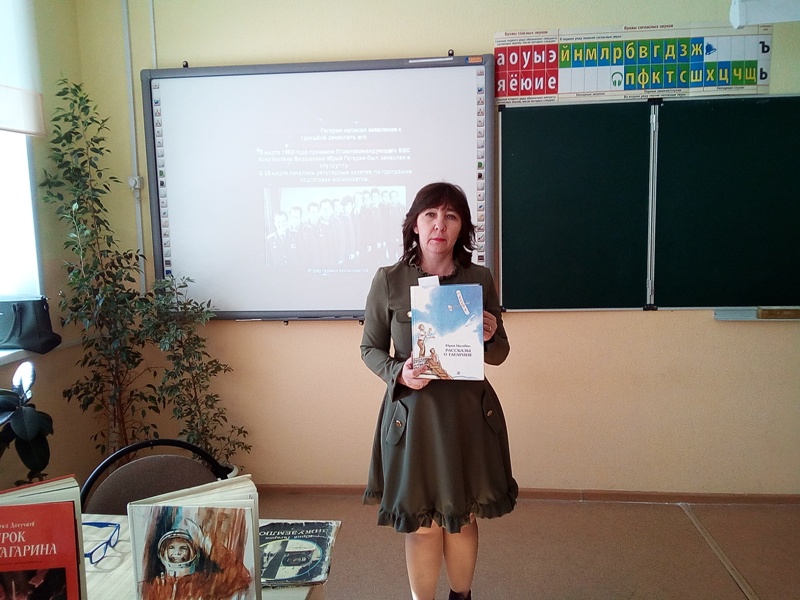 Балалар космонавтның биографиясе белән таныштылар, аның балачакта, яшүсмер чагында нәрсә турында хыялланганын белделәр. Китапханәче Марготнова И. А укучыларга Ю. Нагибинның “Гагарин турында хикәяләр” китабыннан өзекләр укып чыкты. Балалар беренче очыш турында видеоролик карадылар һәм китап күргәзмәсе белән таныштылар.