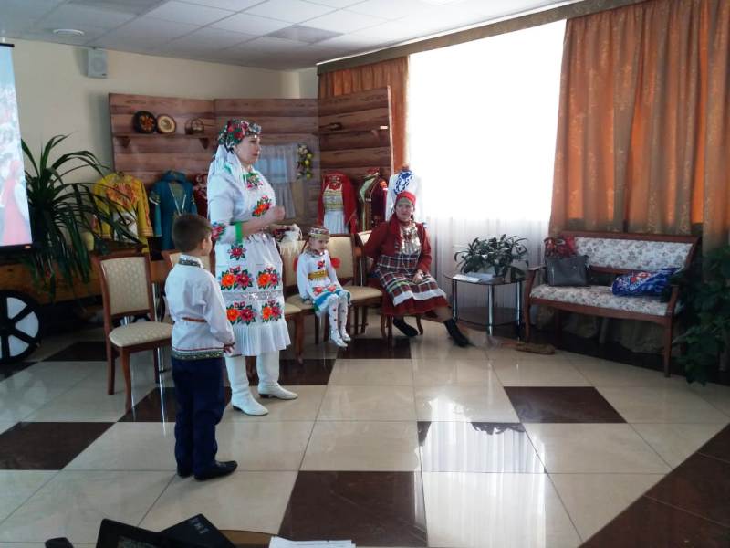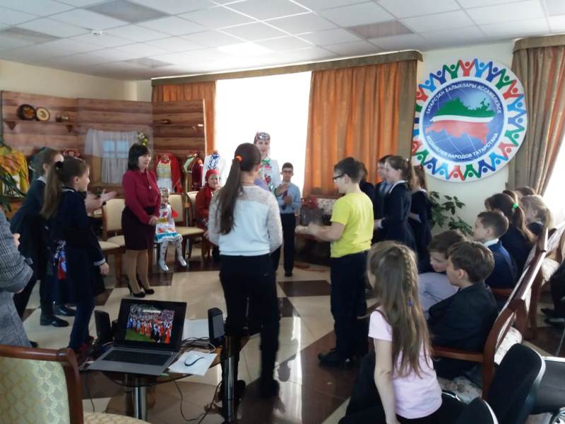 4 «В» (Кузнецова М.В), 4 «Г» (кл.җит.Насыйфуллина Ф. М), 6 «А» (кл.җит.Гимазетдинов М.А.) укучыларына Семяковларның иҗади гаиләсе, Мари мәдәнияте вәкилләре һәм Кузнецовлар гаиләсе, Удмуртия мәдәнияте вәкилләре килде. Очрашуда катнашучыларны сәламләргә Халыклар дуслыгы йорты директоры Габдрахманова Ф. И. килде. Әлеге чарага гаилә алдан әзерләнгәннәр. Алар балаларга үзләренең мили костюмнары турында сөйләделәр һәм күрсәттеләр. Балалар костюмның һәр детале ни өчен билгеләнгән икәнлеген белделәр. Шулай ук гаиләләр мили ризык турында сөйләделәр, хәтта балаларга мариларның ике катлы коймакларын татып карарга да бирделәр: команмелналар. Очрашу кунаклары музыкаль номерлар күрсәттеләр. Кузнецова М.В. удмурт җырын башкарды, Семяковлар гаиләсе мари биюен башкарды. Соңыннан чарада катнашучылар балаларга әкиятләр турында сөйләделәр. Кузнецова М. В. укучыларны Лапшо Педун әкиятенең күңелле герое белән таныштырды, ә Семяковлар гаиләсе Мари легендасын милли герой Чоткаре Патыре турында сөйләде. Очрашу ахырында балалар Удмуртиянең «ПИС БЕКМЫЛЬТОН» (Урони полено) һәм Марий уеннары сокыр та (жмурки) ,вышибаллар белән таныштылар.