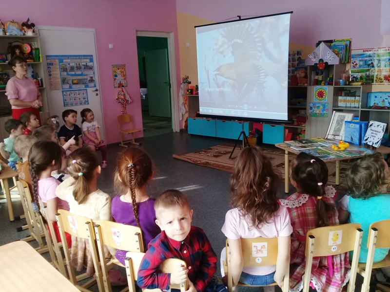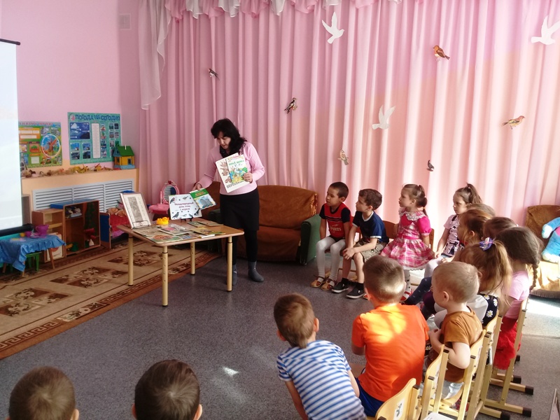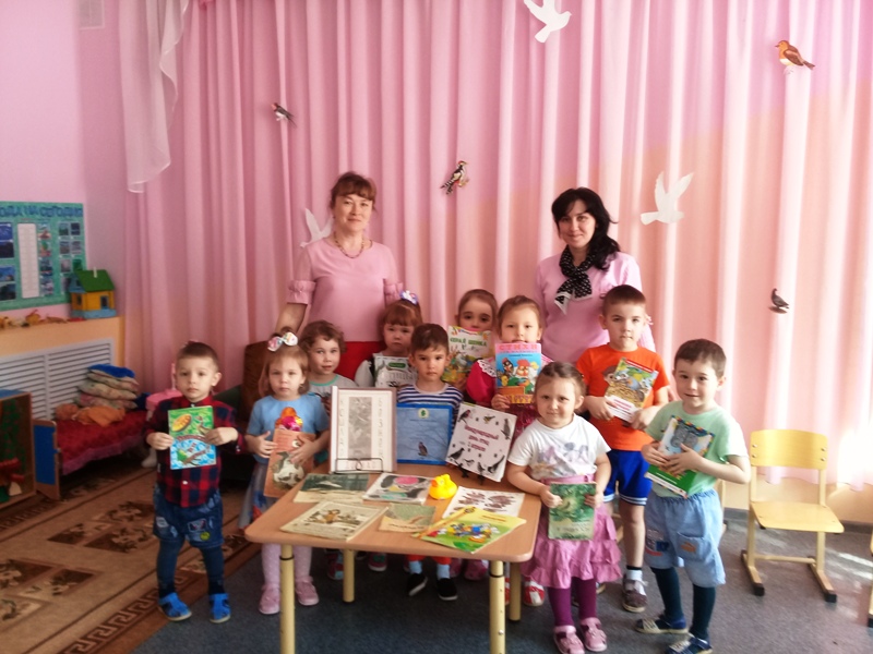 Чара башында балаларга кош тавышларын тыңларга һәм аларны слайдлардагы картиналар буенча танырга тәкъдим ителде. Бу биремне алар бик яхшы башкардылар. Кошлар турында бик куп китаплар язылган. Китапханәче балаларның игътибарын «1 апрель – Халыкара кошлар көне» дип исемләнгән китаплар күргәзмәсенә юнәлтте, алар андагы китапларны кызыксынып карадылар. Тәрбияче Хасанянова Г. белән «Оча - очмый " хәрәкәтле уенын уйнадылар. Чара ахырында барысы бергә «Мактанчык чыпчык», «Куке һәм сыерчык», «Кара үрдәк " кебек канатлы дуслар турында мультфильмнар карадылар.\.jpg)