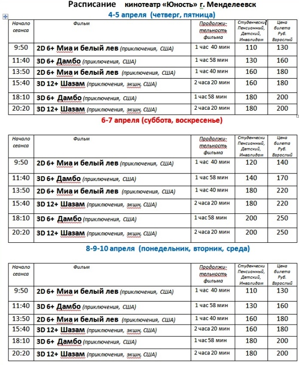 Расписание кинофильм кертелде кинотеатрында «Юность» 4-10 апрель