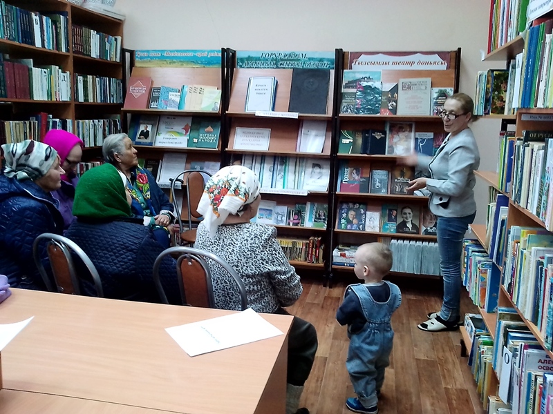 2019 ел театр елы дип игълан ителде. Шуңа күрә әлеге чара “Тылсымлы театр дөньясына сәяхәт” дип аталды.Китапханәче кунакларны “Тылсымлы театр дөньясы ” дип исемләнгән күргәзмә белән таныштырып, Татарстанда эшләп килүче театрлар, драматурглар, режиссерлар, актерлар турында мәгълүмат бирде. Кичәдә катнашучыларга Т.Миңнуллинның “Әлдермештән Әлмәндәр” спектаклен карарга тәкъдим ителде. Кичә чәй өстәле артында яшь чакларында спектакльләрдә катнашуларын искә төшерү белән дәвам итте. Сәгать телләре чаба да чаба...Апаларның аерыласы килми, сөйләшәсе сүзләре дә бетәрлек тугел. Һәрберсенең күңелендә никадәр хәзинә саклана икән бит! Кабат очрашырга сүз куешып,авылдашларым өйләренә таралдылар.