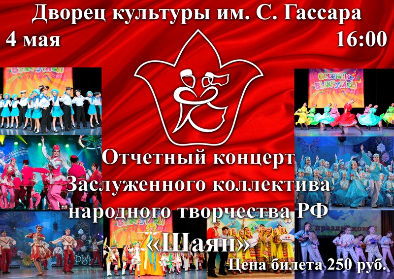 04 май көнне 16.00 сәгатьтә С.Гассар ис. Мәдәният сарае РФнең атказанган халык иҗаты коллективы "Шаян" “Планетада барлык балаларга тынычлык! " дигән отчет концертына чакыра.!” Билет бәясе-250 сум. Барлык теләүчеләрне көтеп калабыз.