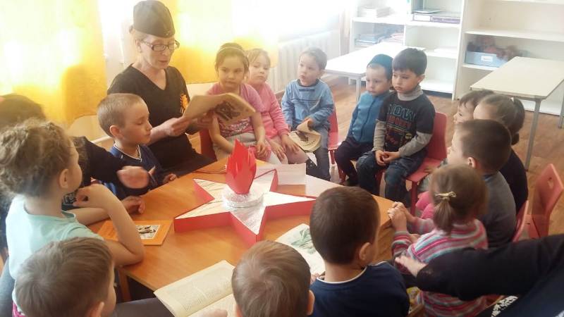 Балалар бакчасы балалары өчен "Без сезне хәтерлибез" дип исемләнгән патриотик сәгать үткәрелде. Китапханәче сугыш чорлары һәм Җиңү өчен түләгән зур бәя турында сөйләде һәм А. Митяевның "Землянка" китабыннан өзекләр укыды.