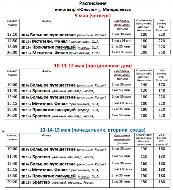 Расписание кинофильм кертелде кинотеатрында «Юность» 9-15 май